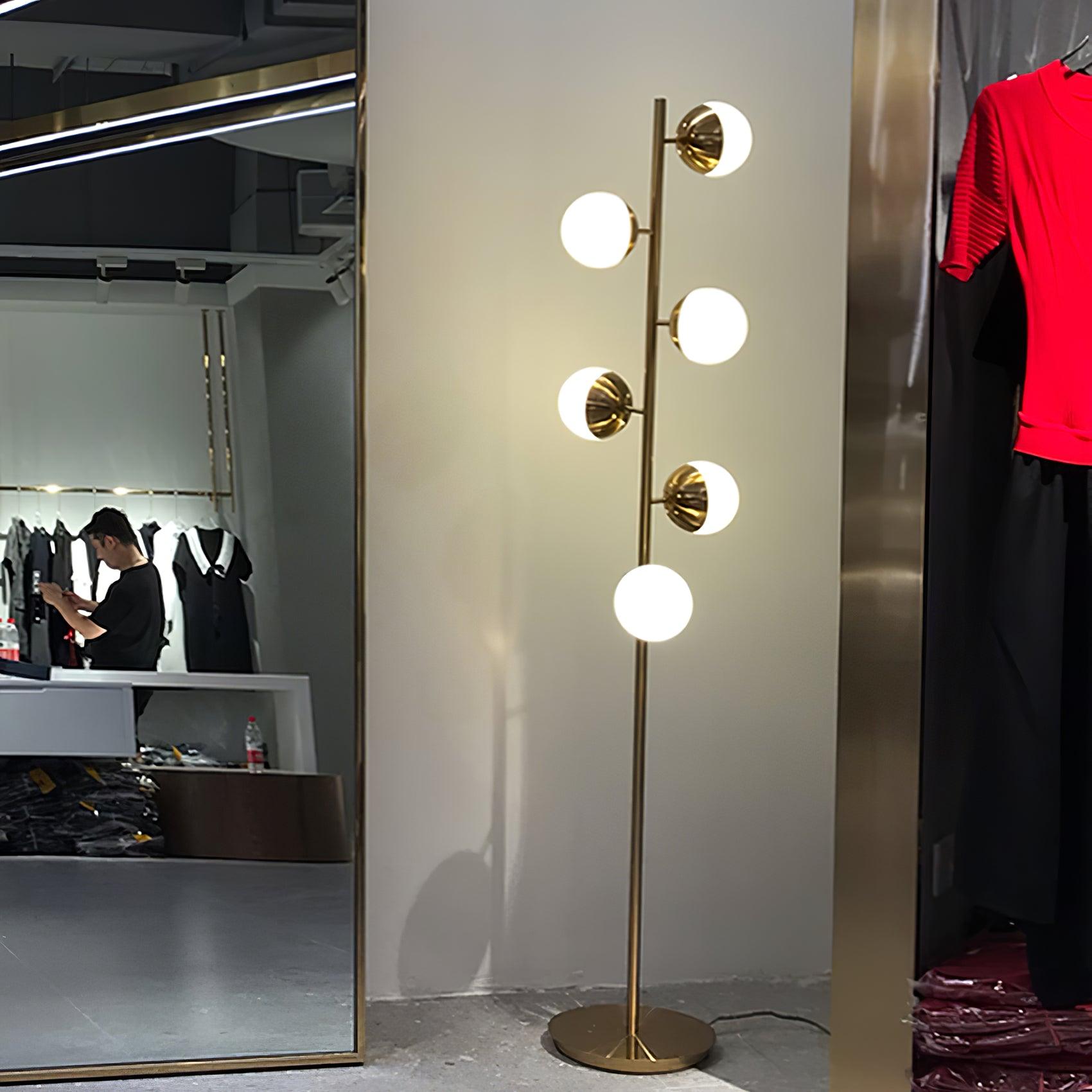 La lumière arbre LED Doppler s'inspire du modernisme du milieu du siècle. Ses multiples globes en verre blanc, harmonieusement espacés le long d'un mât doré, apportent une touche de sophistication. La base carrée en métal doré sert à la fois d'élément décoratif et de contrepoids, garantissant la stabilité de cette lampe tout en ajoutant une note d'élégance à votre intérieur.